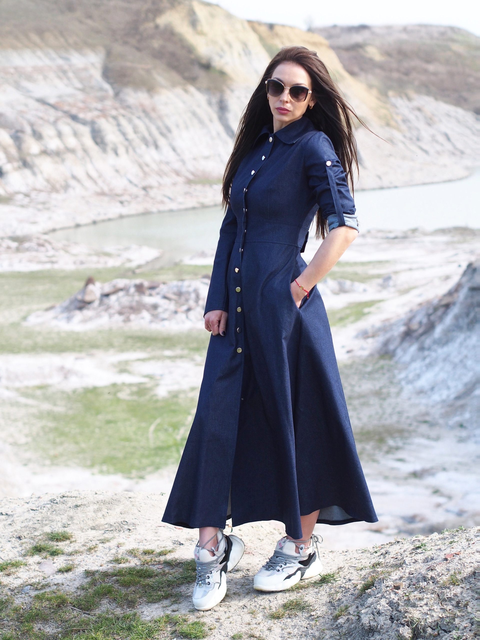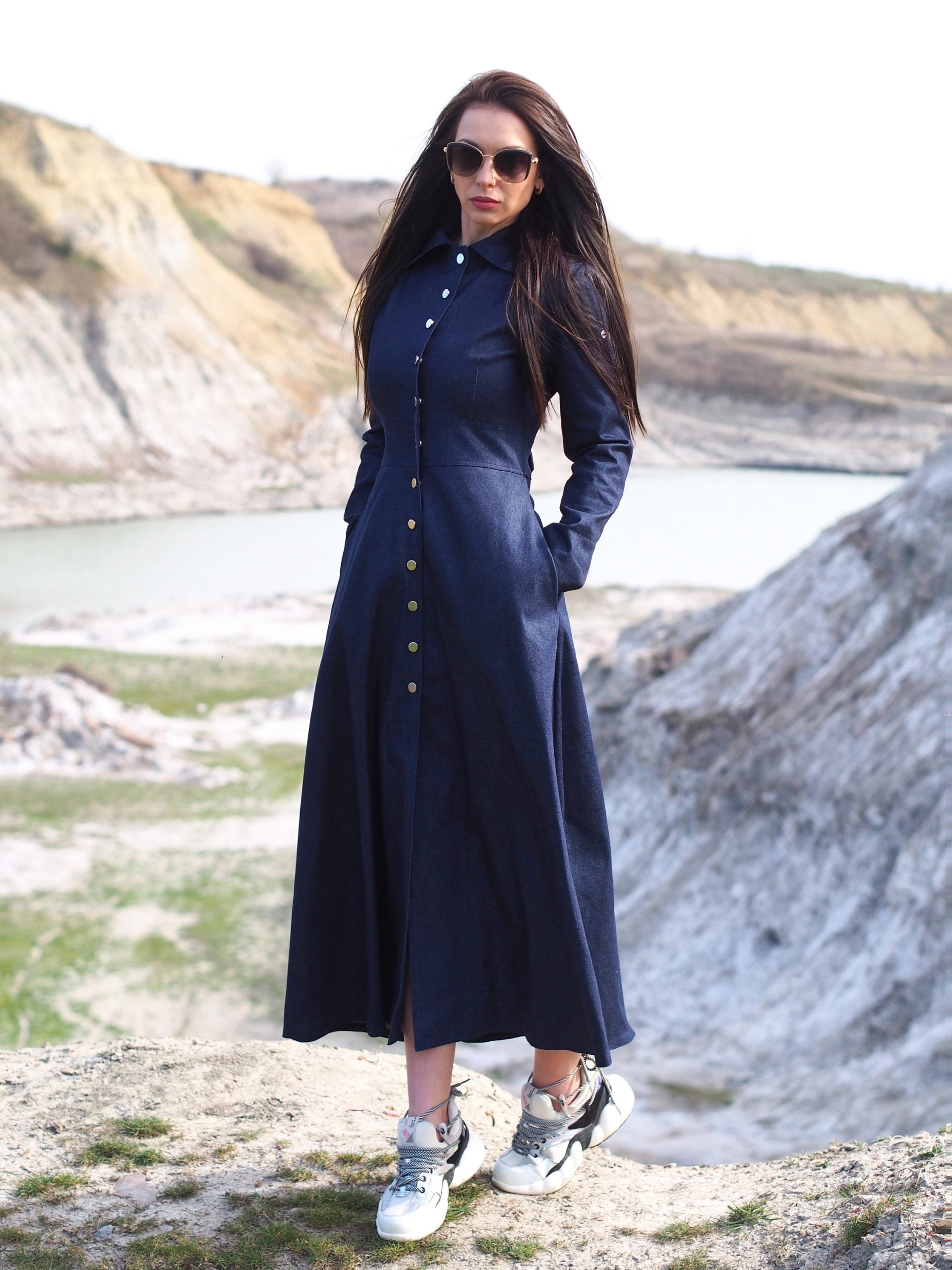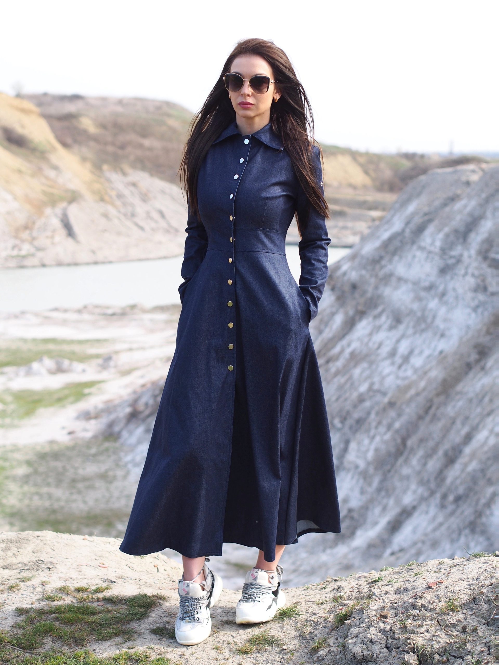 Navy Blue Denim Maxi Shirt Dress Long Button