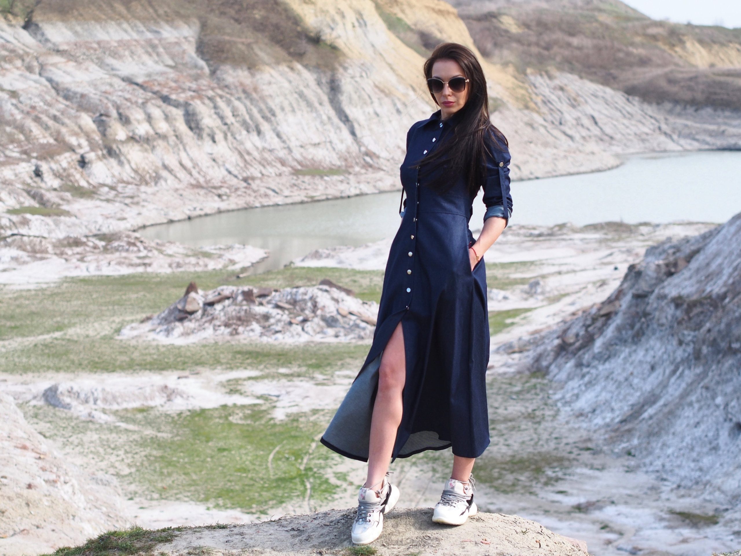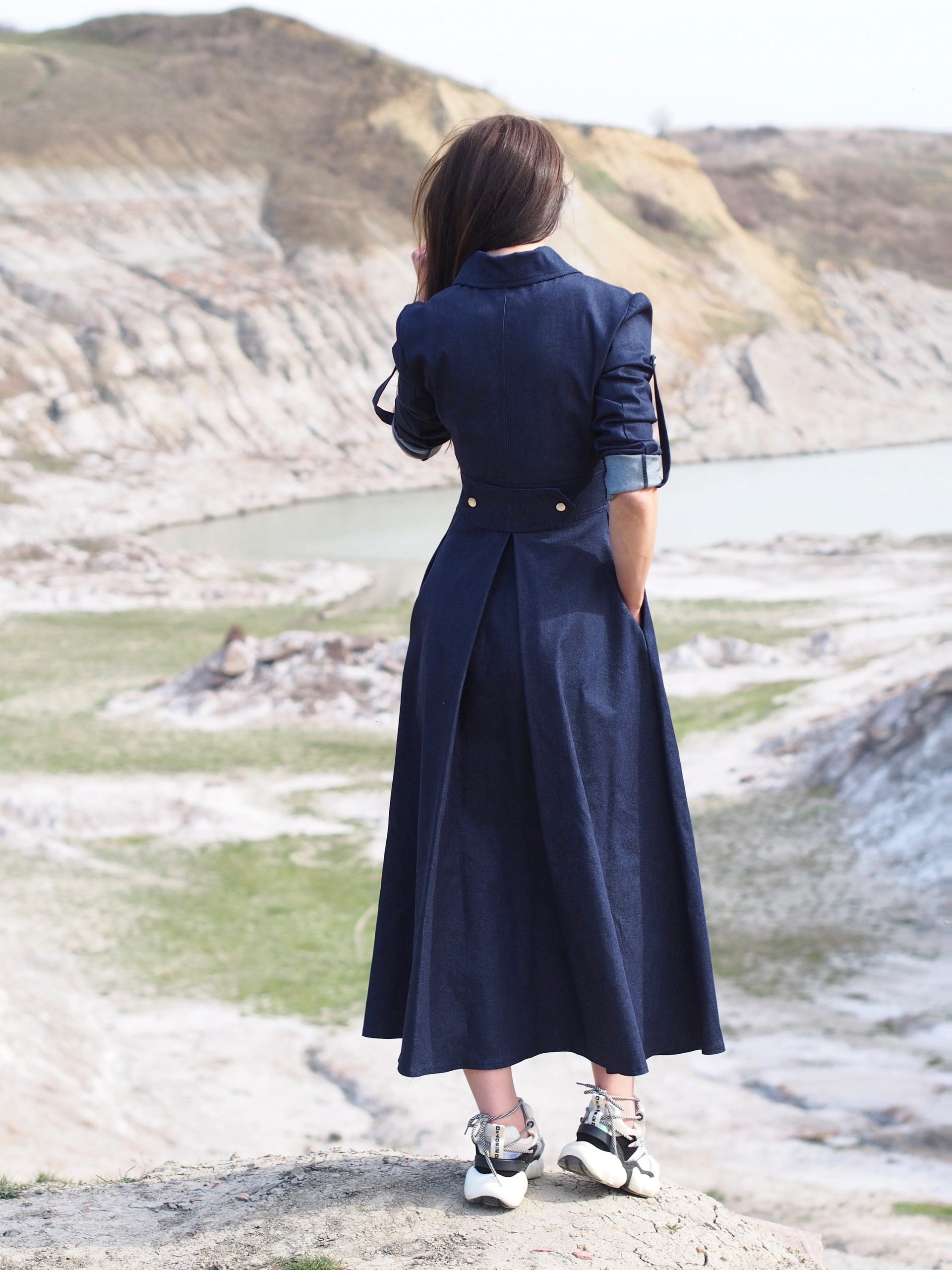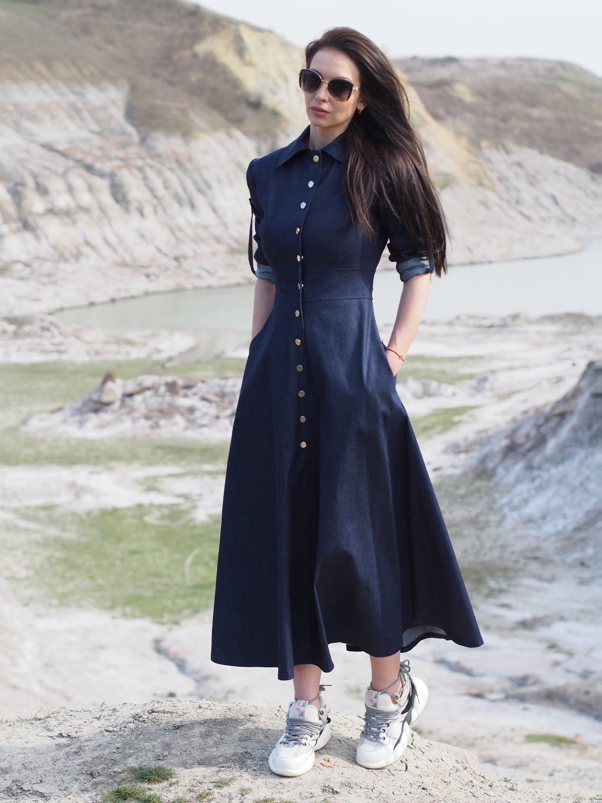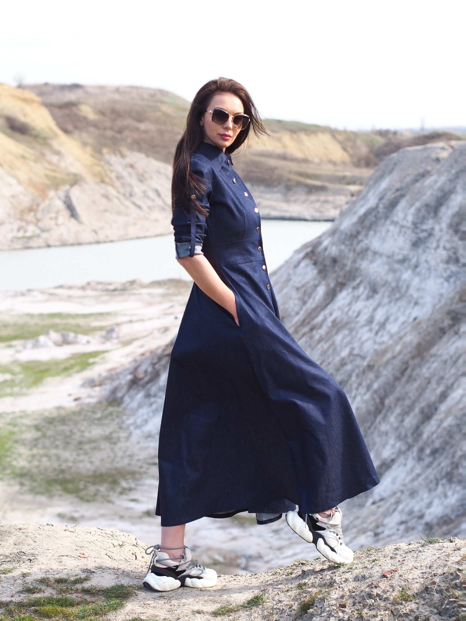 Navy Blue Denim Maxi Shirt Dress Long Button